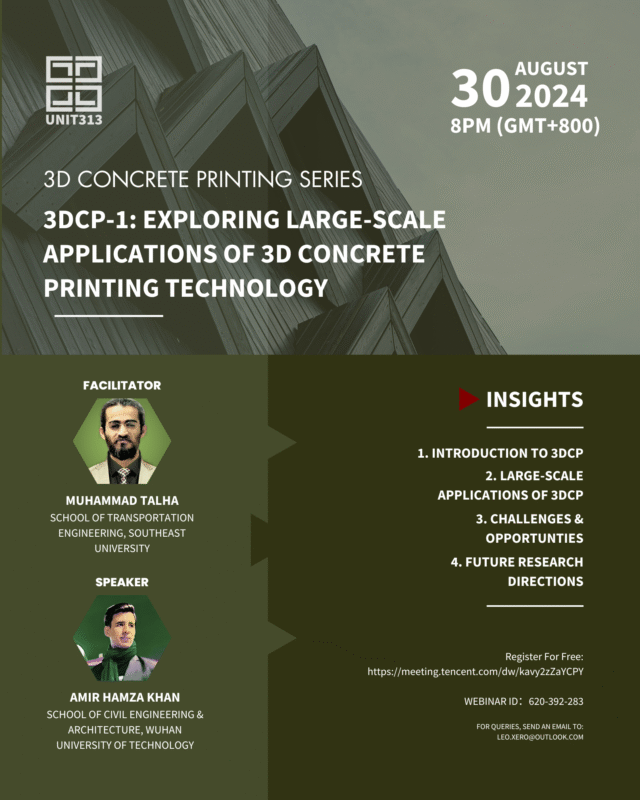 An insightful online session on “Exploring Large-Scale Applications of 3D Concrete Printing Technology” was held featuring Amir Hamza Khan from Wuhan University of Technology and Muhammad Talha from Southeast University. As part of our Miraj initiative, UNIT313 aims to promote advanced research areas in various among graduate students in various disciplines. The said session contributed to our goals by equipping the students of civil engineering, architecture and other related fields with the current state-of-the-art research knowledge.